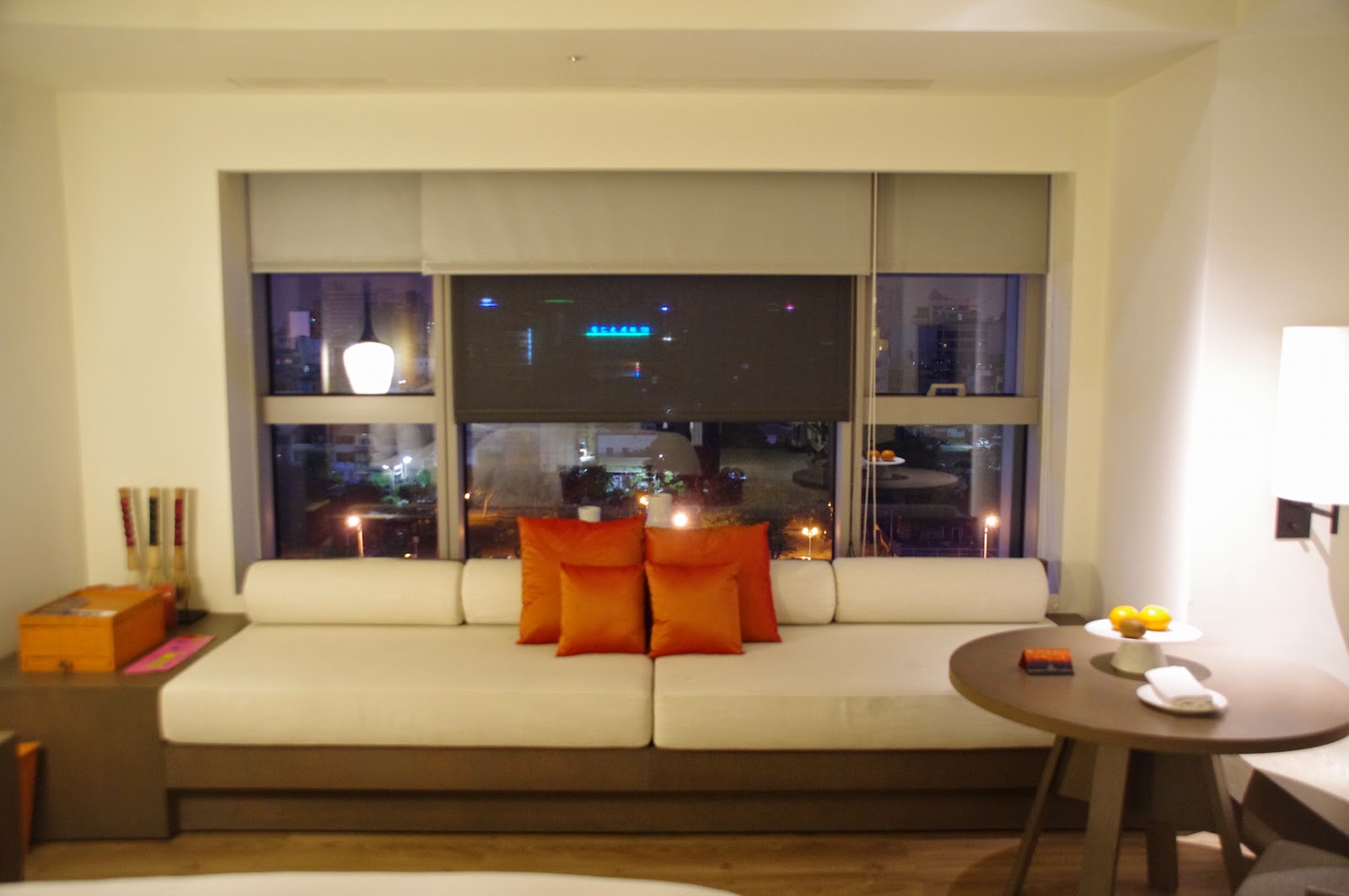 晚上9點多才入住,能享受到飯店設備的時間,還真的不多,連拍照都嫌趕,個人很喜歡靠窗的那排沙發,你可能會好奇,浴室呢?就在這張照片,我拍照位置的平行左手邊