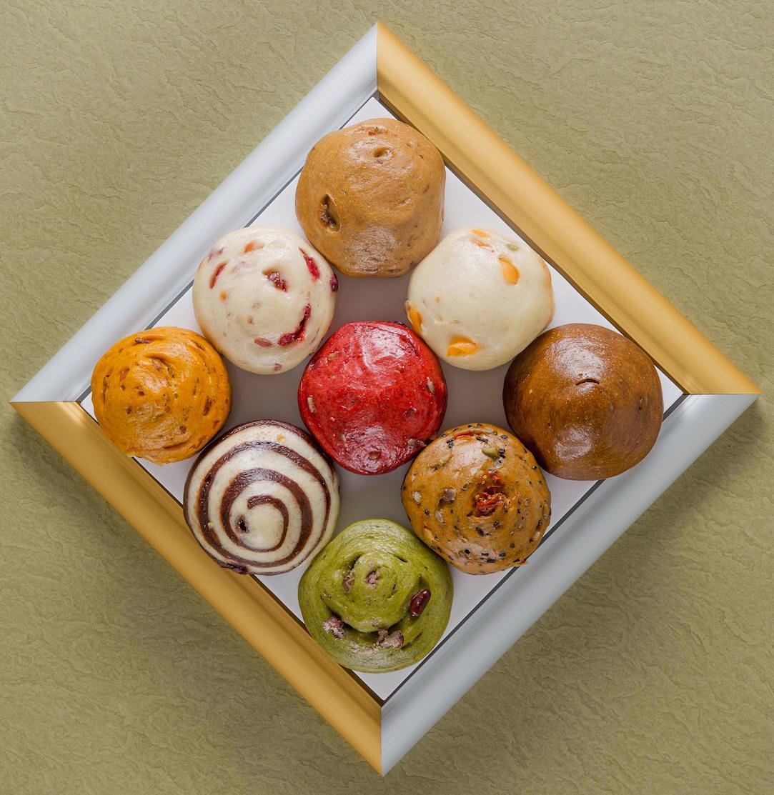 這次,看到了更多口味的饅頭,螺旋的這個是圈圈朱古力饅頭,加了可可粉;綠色的是翠綠茶香,也就是抹茶饅頭(我的最愛);翠綠茶香的五點鐘方向則是金色年代,用的是金桔;其他還有咖哩口味、榛果咖啡、用了桂圓的富桂滿香,看起來都是好吃的感覺。