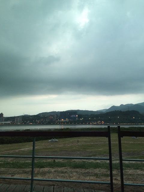 約莫6點40左右,我騎到了社子島頭公園,距離我從民生東路開始騎的天空,已經明顯變暗許多,這一張,是我把眼鏡放在iPhone 5s相機鏡頭前拍攝的畫面,