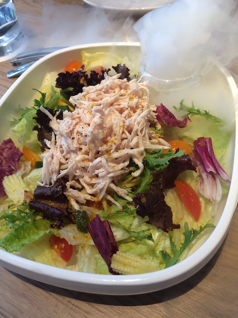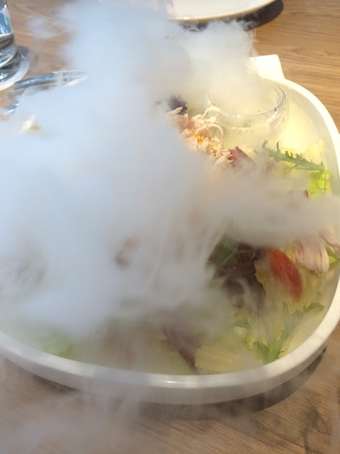 居然出現一道有乾冰的食物,這道叫做南洋咖哩冷麵,端上來時搭配香茅乾冰,對食物沒什麼差別,不過坐在周圍的人,就可以聞到香茅的味道,就是南洋風味的感覺,這道我喜歡。