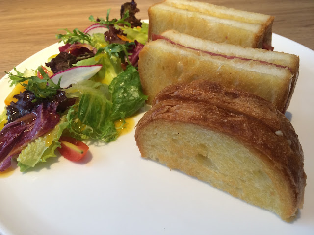起司火腿奶油脆煎三明治,用吳寶春的脆皮吐司,比利時Ardenne天然發酵奶油,這道好吃,結果都忘了吃生菜…..