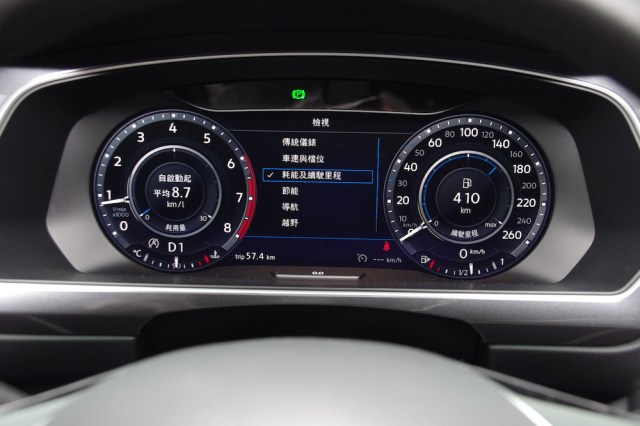 圓形儀表裡跟兩個圓形儀表中間,都會提供各種不同資訊做切換,雖然資訊很豐富,但太豐富的結果就是閱讀好像有點辛苦….Active Info Display 全邏輯數位化儀表是330 TSI以上才有標配。