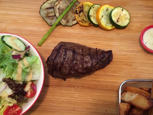 10OZ的牛排上菜了!不是擺在瓷盤上,也不是放在鐵板上,而是放在沾板上,搭配醬料、套餐附的沙拉、薯條等,之前似乎沒吃過放在沾板上的牛排,這樣的好處,除了跟瓷盤一樣不會有冒出一堆煙,看起來更具居家感,而且在切的時候,不用害怕刀叉與磁盤接觸到的不舒服聲音,你知道我說的是什麼