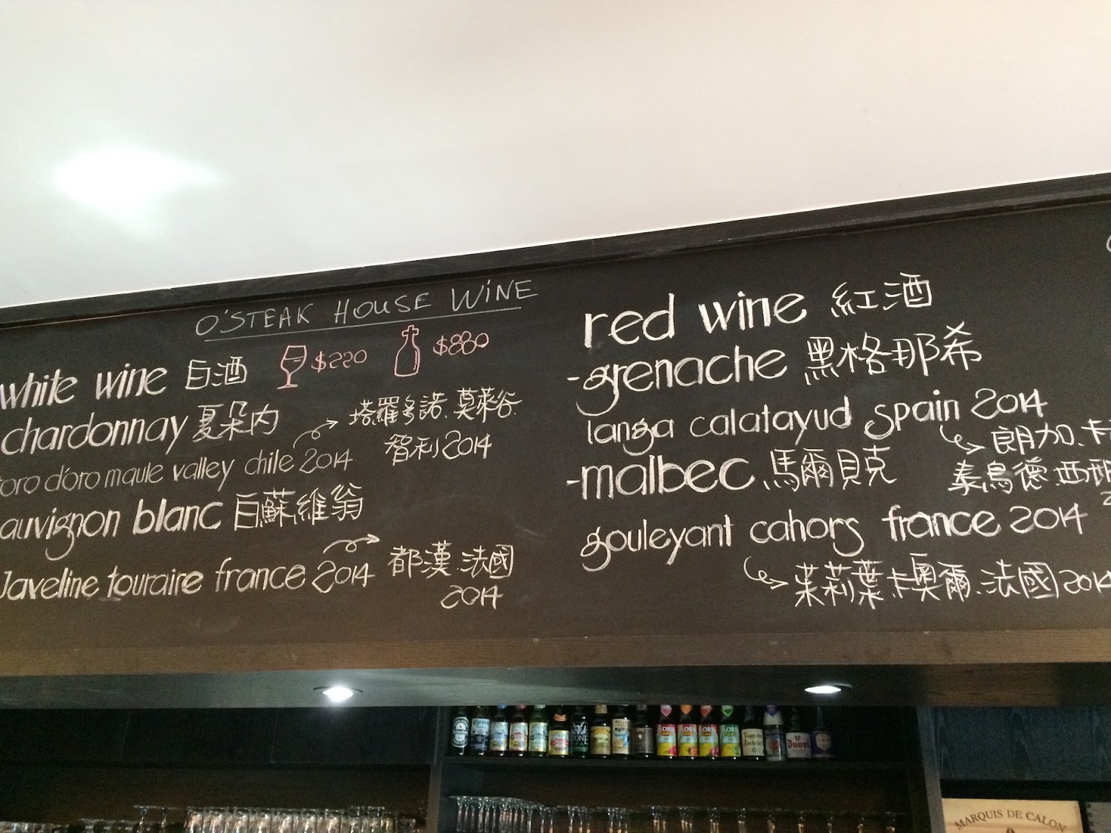 牛排是餐廳的主要賣點,不過店內也提供紅白酒的選擇,因為當天有開車,所以沒辦法喝,對了,如果你是開車來,在Osteak門口的金華公園底下,是停車場,開車非常方便。