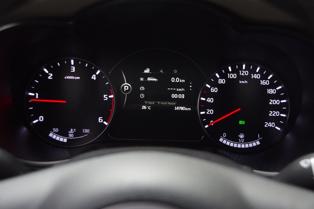 儀表板部分我也比較無感,同樣是因為 Civic 8 的上下雙層儀表板實在太炫了,看到 Carens 的,就有一種回到現實的感覺,好吧,誰叫 Civic 8 設計的太好看了。這組雙環儀表板,中間有車用資訊,油耗跟行駛里程都看得到,介面裡卻沒有中文可選,雖然英文也是看得懂,但就是不貼心的感覺,多個中文介面哪有那麼難?
