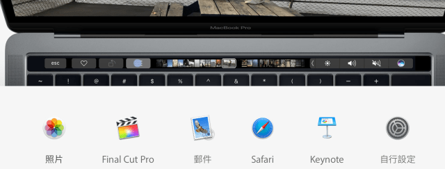Touch Bar 設計,算是這一次非常新穎的亮點,把過往很無用的 F1-F12 取消,改成觸碰式的按鍵設計,把很多功能都放在這條觸碰Bar上面,針對不同模式有不同的顯示畫面,其實有點喜歡這設計,只是暫時的,我還是習慣目前的 fn+ F1-F12 的操作模式。