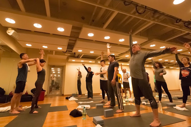這次是由一位男老師帶領,陪旁的助教,是個已經60多歲,但身體狀況跟外貌一點都逆齡的時尚阿嬤陳冬蓮,他說他剛開始練瑜伽,手根本碰不到膝蓋,7年之後,他擁有非常好的身體柔軟度,搭公車刷老年悠遊卡,還會因為看起來很年輕,被司機懷疑。