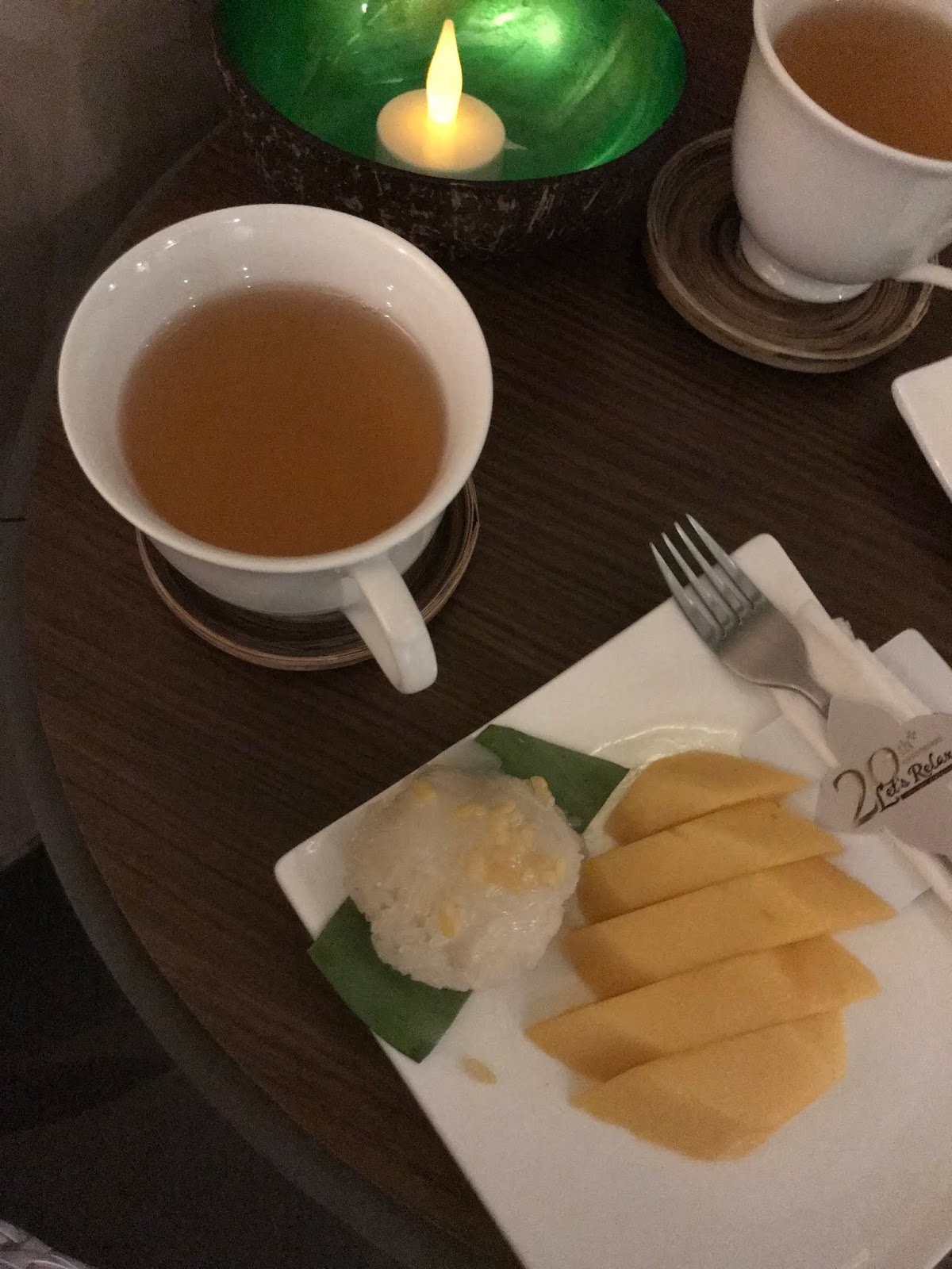 我們選的是針對腿部和背部的泰式按摩,先是坐上蓬鬆柔軟的皮革功能椅上按腿,師傅手法純熟、空間也讓人很放鬆,我們被按到睡著,後來換坐一種特製椅子上按摩背部,肩頸的筋骨都被鬆開非常舒服(頭、手其實也都會帶到),按完不要馬上走,因為他們還會送上香茅茶和芒果糯米糕喔,很好吃!