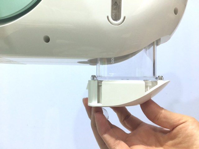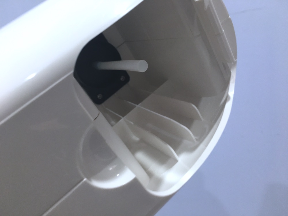 底部的另一個重點,就是水箱的位置,必須要兩指壓住後才能開啟,打開水箱後,就看到一條管子,這管子必須放進水箱裡,裝滿抗菌液,打開開關後,就會從水箱裡吸取抗菌液,再從噴頭裡噴灑出來