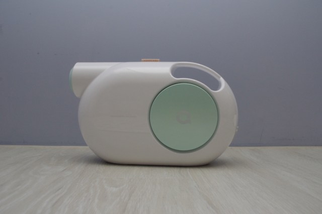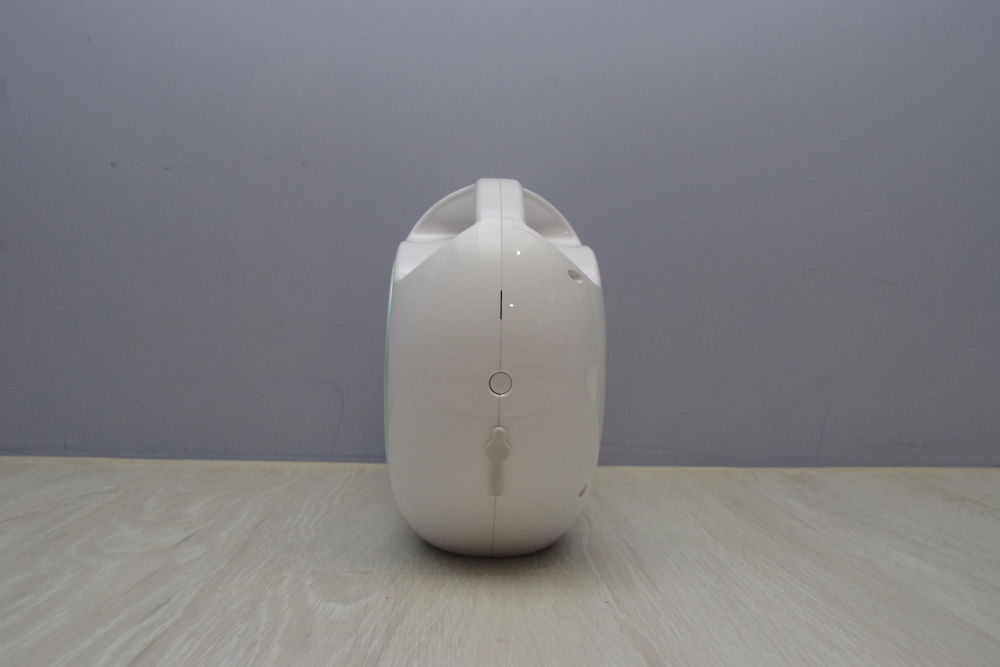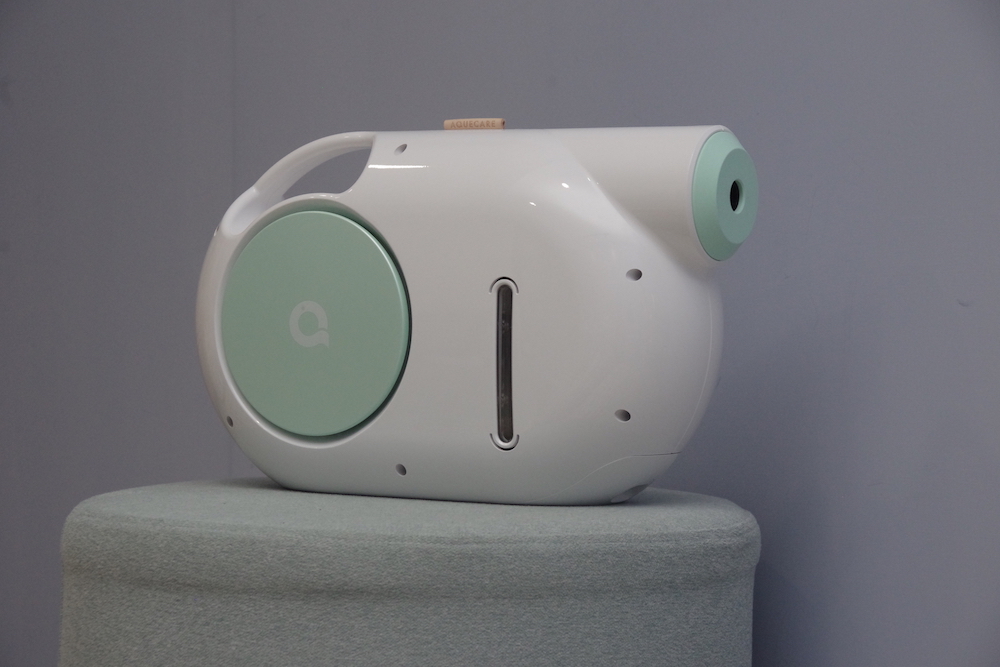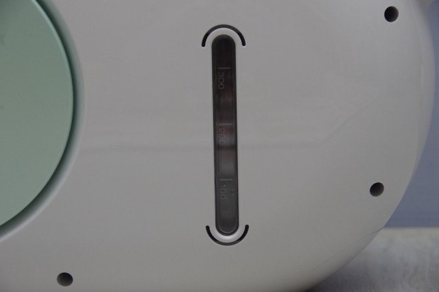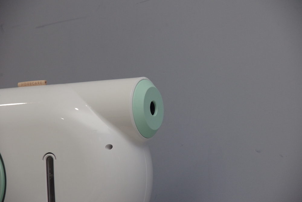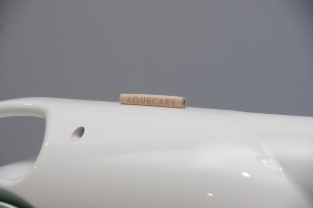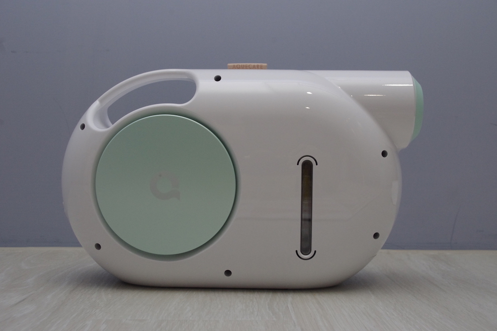 中間圓型的位置,印著一個「a」字,在握把的上方,也有一個「Aquecare」標籤,兩面的設計完全不同,一邊乾淨無瑕,另一邊則有水位指示,有300毫升的水箱容量