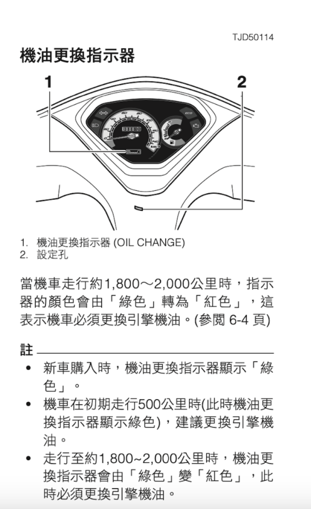 這點其實藏著玄機,雖然是寫2000公里,但其實還有一個條件是「或3個月更換」,如果沒注意到這點,像我大概是快4個月才會快2000公里(機油燈大概都是1700公里亮燈),但已經有出現吃機油問題,而且我用的都還是Yamaha的4X機油,在機車行建議下,回到1000公里就換油,原廠的規範讓人有被騙的感覺