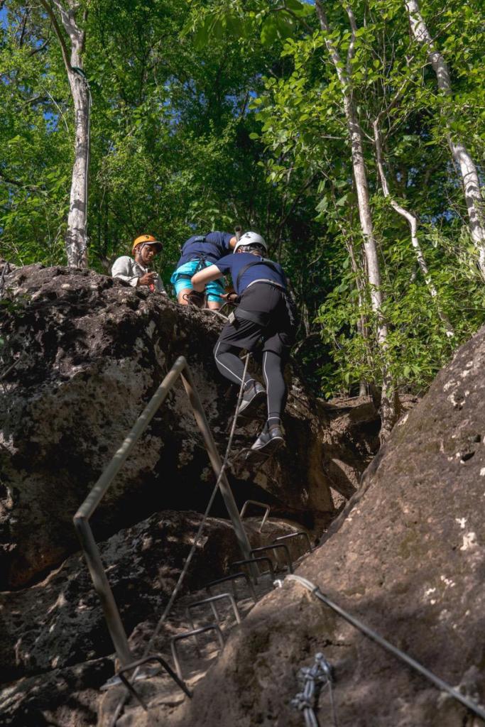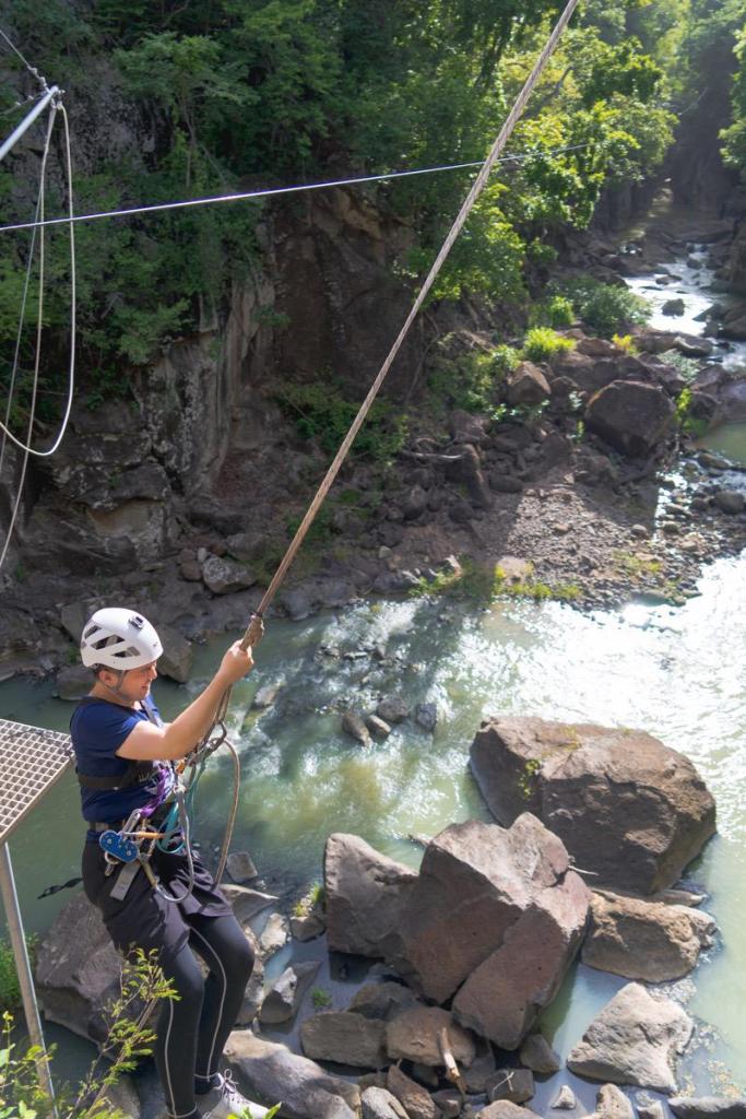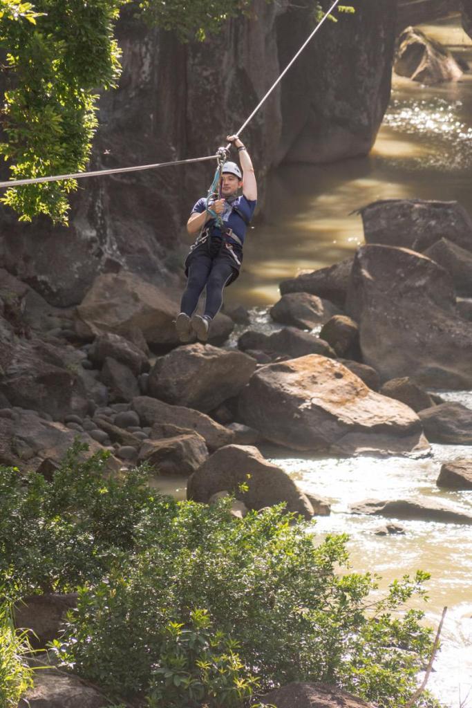 明明我其實是個怕高的人,當初有三個行程可選,我記得另一個是類似朔溪,但我最後卻很白目的報名高空滑索行程,穿戴好安全裝置及安全帽,在峽谷中用繩索穿梭其中,有些只有幾公尺長,有的則多達數十公尺,最後一個甚至長達200公尺