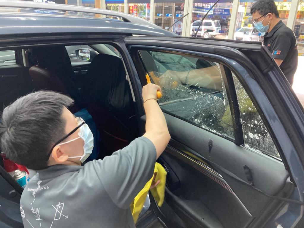 因為我這車之前無隔熱紙,所以沒有得撕去舊隔熱紙去除殘膠的問題,可以減少這流程,但還是得做好清潔,避免之後隔熱紙因此出現氣泡,那就糗了