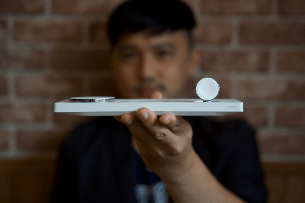 給Apple Watch的充電部分,中間圓形磁吸部分是可以手動升起,Apple Watch直接橫放上去就能充電,前方還有Belkin的品牌名稱
