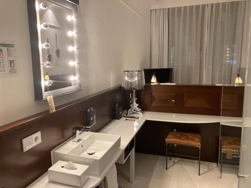 不過這種市區的飯店也不意外,畢竟是在法蘭克福市中心,一進房間就真的是小巧玲瓏,走道除了很小,旁邊還有桌子,洗手台就在浴室一出來的地方,有趣的是,它的鏡子是有網美燈,我不是網美,但這聽起來不錯吧