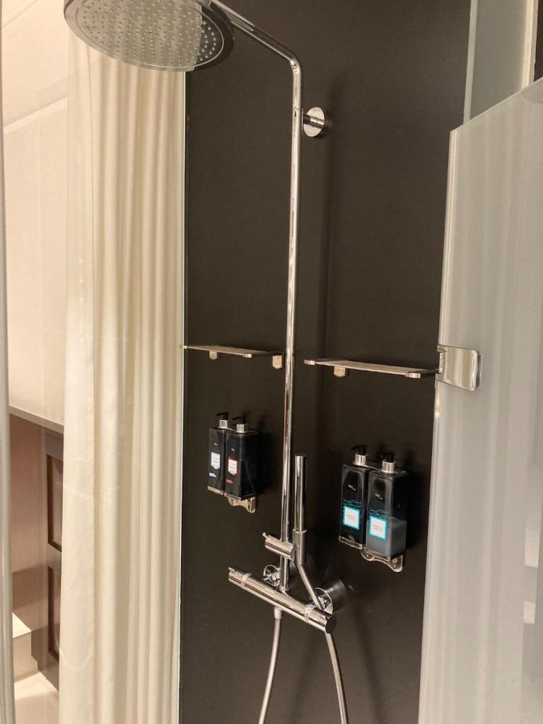 空間真的小,導致也沒衣櫥,衣架直接就掛在牆壁上,房門的後面還有一面全身鏡,還好雖然這麼小間,淋浴間跟馬桶還是乾濕分離的