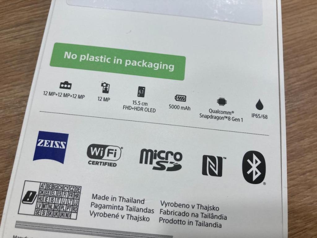 不一定知道這支手機的規格,Sony知道,所以它在盒裝背面放了相關資絢,包括處理器、相機、螢幕等,當然還有IP65/68的防水能耐,號稱無塑膠的盒裝,手機則是泰國製造