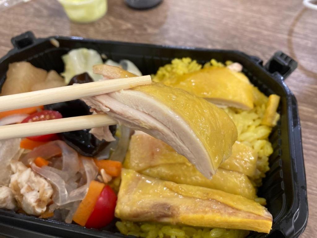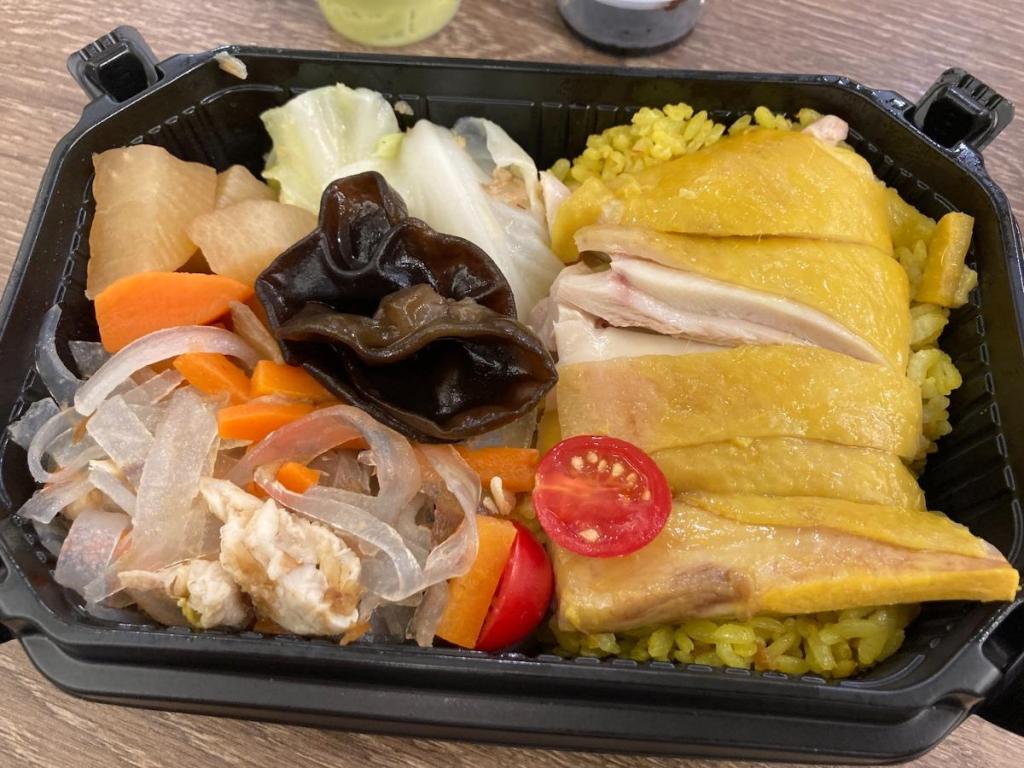 海南雞飯的便當是110元,有薑黃飯跟雞油飯兩種飯可擇一,除了一次太晚去買,所以選了🐔雞油飯,其他的幾次都是選薑黃飯