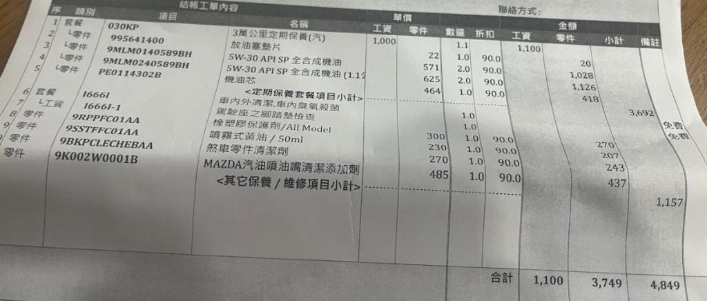 最終讓他們施作的,就是橡塑膠保護劑、噴霧式黃油、煞車零件清潔劑跟汽油噴油嘴清潔添加劑,這幾個我的看法是,可做可不做,畢竟車輛還算新,但考慮到這加一加大約就是1000元多一些,就當作是讓原廠賺一點小錢這樣
