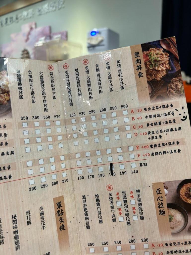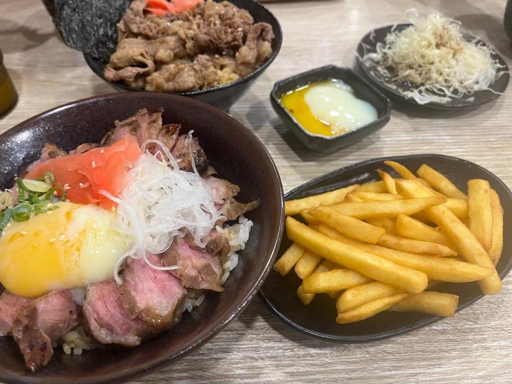 菜單裡除了單點,還有六種套餐選擇,我們單點了一份炙燒雪花豚丼飯,另外就是點一份炙燒厚切牛排丼飯,搭配C餐的黃金脆薯跟溫泉蛋