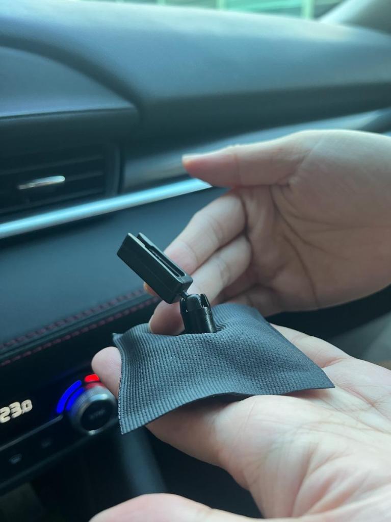 我把它夾在副駕駛座那邊的出風口,因為是黑色的關係,剛好跟我下方的黑色皮革還蠻搭的