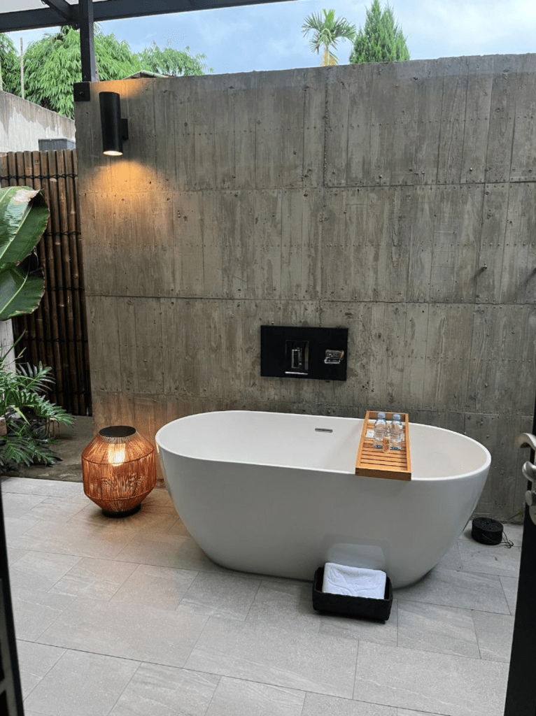 房間裡也符合奢華的訴求,把浴缸獨立出來,從浴室搬到戶外露天環境,即使是浴室,也有著看得到天空的透明天花板,讓自然景致零距離
