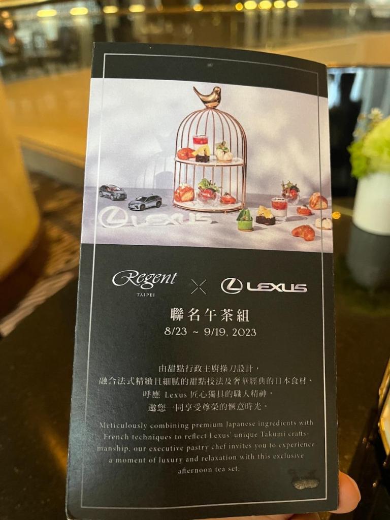 Lexus與晶華酒店合作,除了現場展Lexus的新車,還有聯名的下午茶組,名為Regent x Lexus 聯名午茶組,最近的一次聯名活動在9月19日已經結束,來看看晶華跟Lexus端出什麼精緻午茶吧!