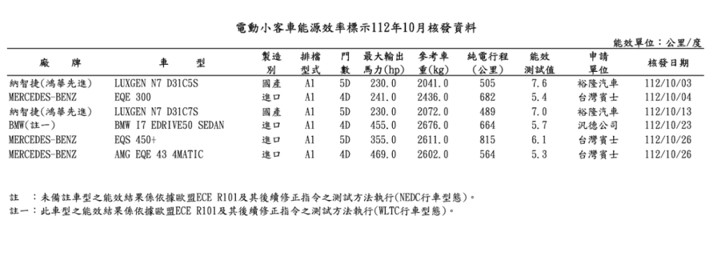 10月的電動小客車能源效率資料,LUXGEN N7 D31C5S應是指五人車型的5人亮點版跟5人純粹版,能效測試值是一度電跑7.6公里。