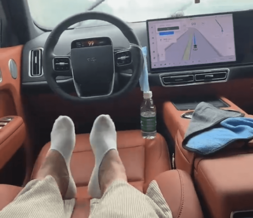 其實也不只台灣車主,中國一位駕駛理想汽車品牌的車主,啟動輔助駕駛後,不但沒把手放在方向盤上,他反而是脫了鞋,放倒座椅,平躺在座椅上,觀看放在後座車頂螢幕播放的電影。