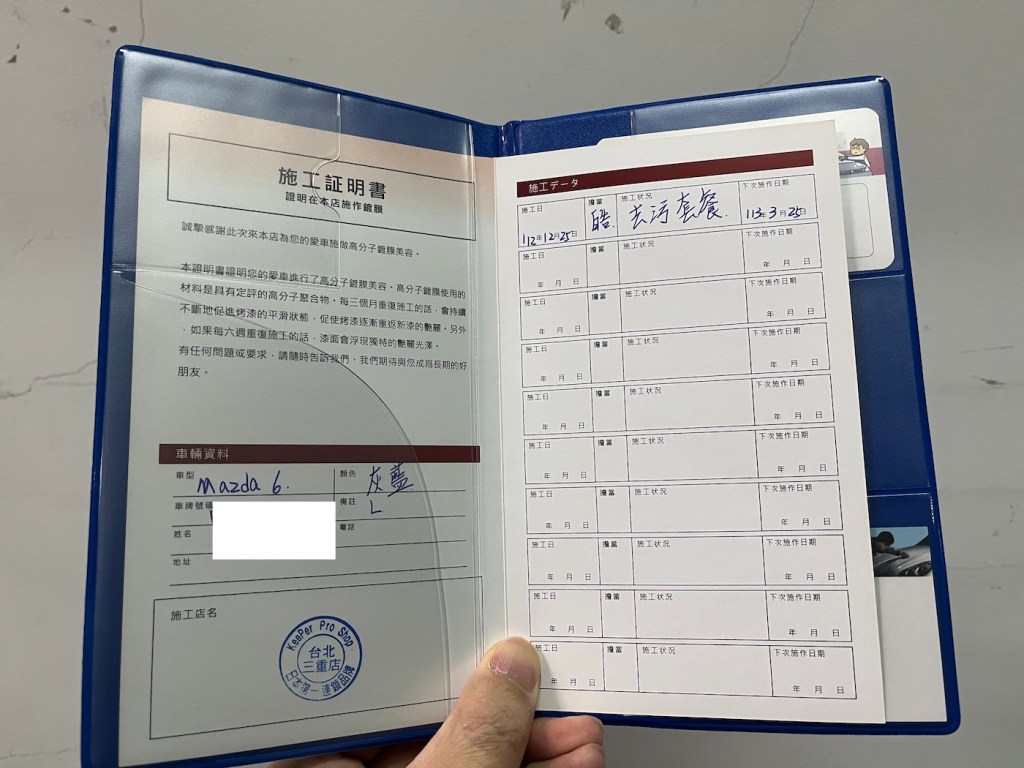 整個完成之後,他們會提供一份手冊,上面就是這次鍍膜的紀錄,建議三個月做一次鍍膜,讓車漆保持在最佳狀態,因為已經有第一次消費了,成為他們的客戶,下一次再來就享有專屬的特價,這點也是之前沒看過的定價策略,對客人而言會蠻有吸引力的