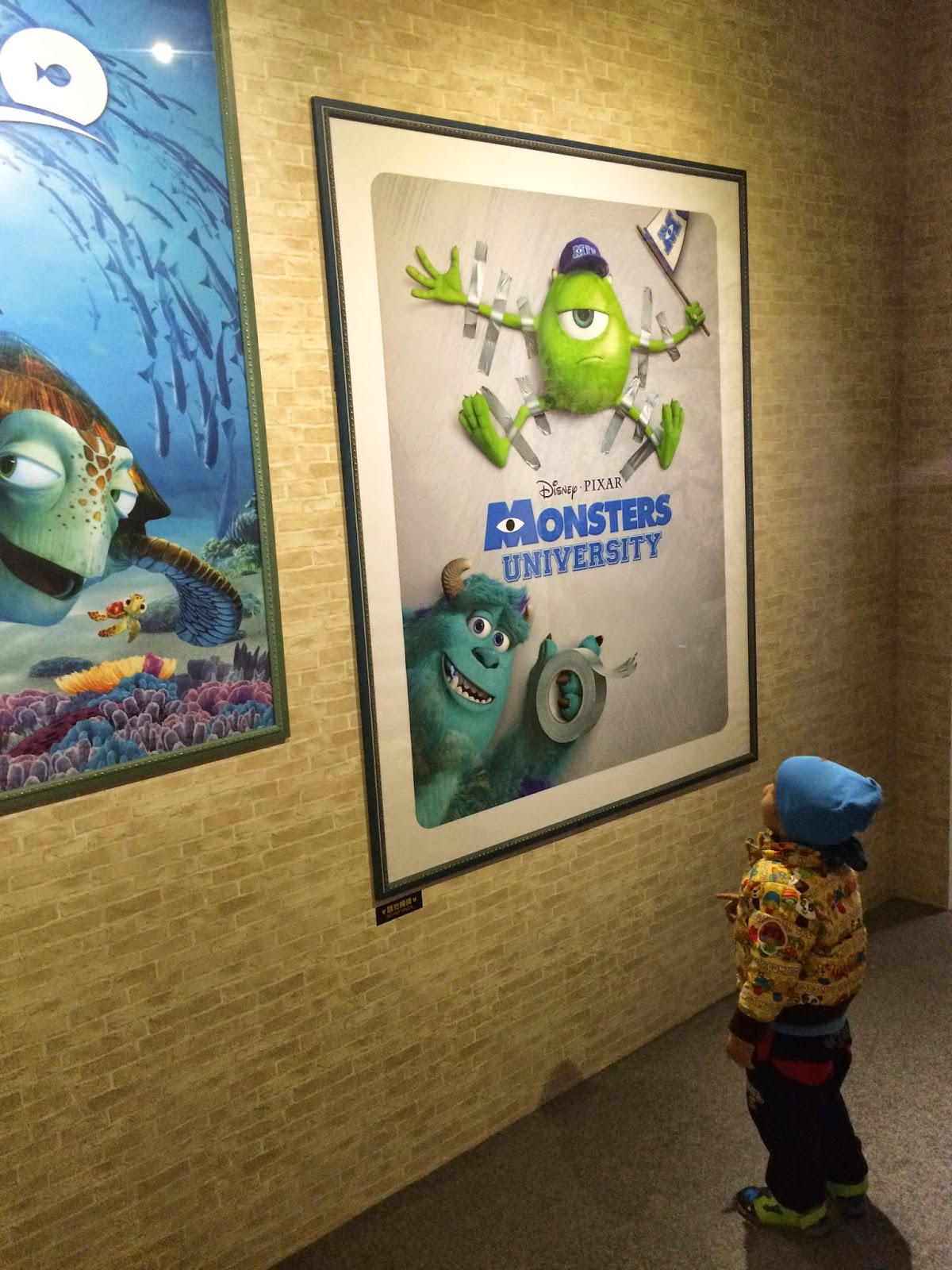 很專心在看著怪獸大學的小朋友,很有愛的感覺,他看Cars的海報時也很認真。