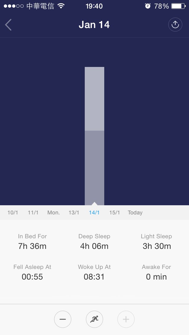 它也可以用來偵測你的睡眠,我自己是不愛帶著手錶或是其他手環睡覺的,有一天我就嘗試戴著它睡覺,還不錯的是,有八個洞可扣,我是調整成最鬆的那一個。隔天起床,同步了手機,我看到了這個。