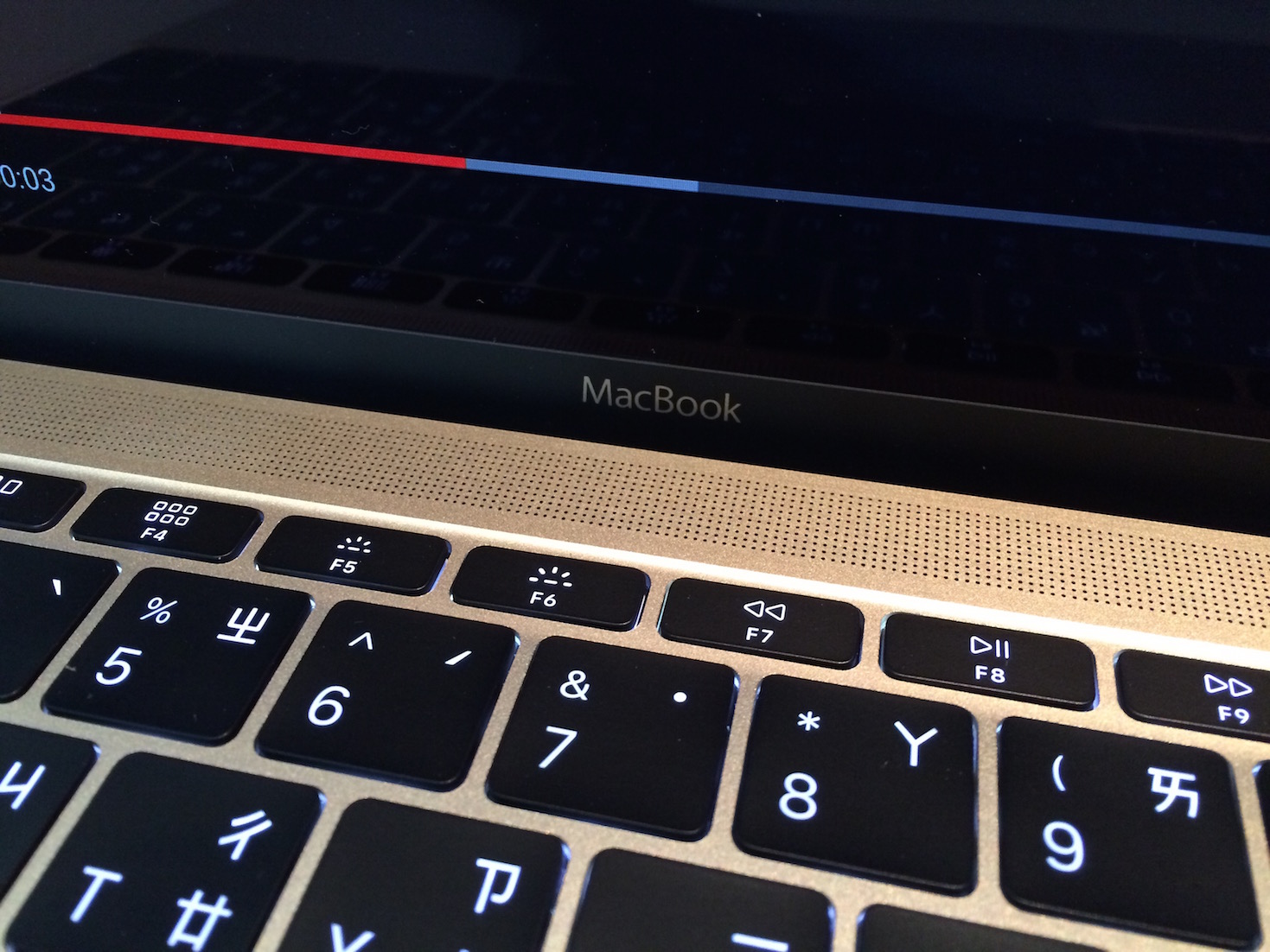 這張照片是用HTC M9拍攝,可能因為是在白色光源底下拍攝,金色感不那麼明顯,不過還是可以看得出iPhone 5s的金色其實相對比較淺,iPhone 6 Plus金色較深,Macbook的金色則在兩者中間。背後是我自己的Macbook Air,沒有發光的蘋果,其實依然好看,只是蘋果Logo很容易沾指紋,就跟我的iPhone 5s一樣,三不五時要替他擦拭,這樣的光澤才好看。這一次的Macbook,讓人驚豔的,就是12吋的機身,卻只有不到1公斤的重量,機身的超薄程度,更是讓全世界都驚呆了,而這次的特點,更是包括了這個USB Type-C連接埠,以前旁邊的什麼電源線接頭、USB孔,現在全都只靠這個Type-C來處理,往好的地方想,這讓Macbook的外型更簡潔,機身更薄,畢竟現在很多資料,都是仰賴雲端來存取,現在或許會覺得只有一個接孔很麻煩,但應該在兩年內,這就會成為筆電的一個基本配備。(雖然我自己也覺得不習慣啦)耳機孔在目前為止,至少還是3.5mm圓孔,所以還是保留在Macbook上,兩個小點則是雙麥克風的設計,透過Macbook接聽來自iPhone的電話,不過當下我還沒機會試試看收音狀況。鍵盤大概是我使用最不習慣的部分,對於習慣Macbook Air的鍵盤,再去打這組Macbook的鍵盤,我第一個感覺會是很像在打觸碰螢幕的感覺,回饋感很模糊。當我要按右上角的Delete鍵時,因為位置的習慣,我會按到旁邊的+鍵,不過有趣的是,當我試著越打越多字的時候,回饋感即使一樣模糊,但有覺得漸漸順手的感覺,可能給我一個週末的時間,我就能上手了吧(笑)喇叭位置設計鍵盤前方的位置,有的人不喜歡,我是覺得還好,實際拿他跟Macbook Air做比較,還是後者好一點,但重點是,Macbook在這麼薄的機身裡,最厚的地方也才1.31公分,還能做到跟Macbook Air沒有落差太大的音質表現,這個技術太強大,這樣一相比,Macbook的音質真是好的恐怖。對了,照片上的鍵盤當然也有背光設計,一貫的Macbook特點。這部分的薄度真是嚇人,雖然沒有實際測量,但官方數據是0.35–1.31 公分,這邊的薄度,大概也不會超過0.5公分。話說我個人很喜歡這次的觸碰板設計,當你使用觸碰板點選時,是不會有聲音的,這樣別人就不會知道你一直在點點點點點…….