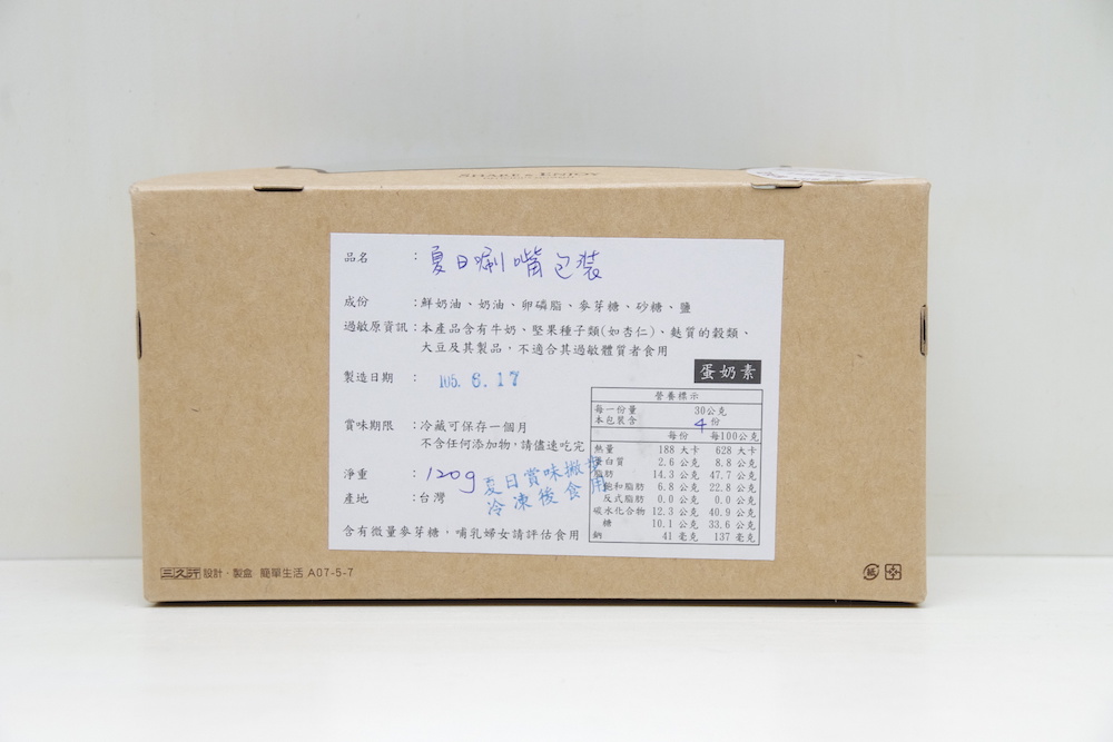 紙盒的底部,則有列出了詳細的食用資訊,包括過敏原,賞味期限,成分等,看到產地來自於台灣,真是讓人開心,誰說台灣沒有健康好吃甜點呢?
